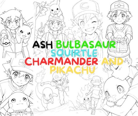 Ash Pokémon Coloring Pages | Pikachu Charmander Squirtle Bulbasaur Coloring Book | 50-Page Digital Download | Thick Line & Sketch Style Pdfs