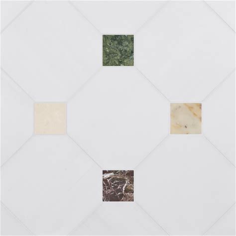 Alaris Glacier Octagon With Verde Dot Honed Marble Tile | White | 12" & 4X4"