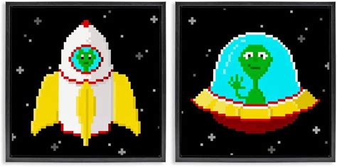 Pixel Alien Spaceships By June Erica Vess 2-Pieces Gray Floater Frame Fantasy Graphic Art Print 18 in. X 18 in.