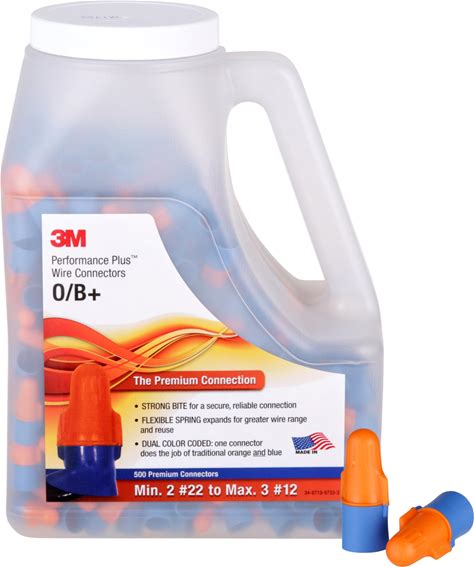3m Performance Plus Wire Connector, O/B+JUG, Orange/Blue, Flexible Steel Spring Connectors, Twist On, CSA Certified, UL Listed, Jug Of 500, 22-12 AWG