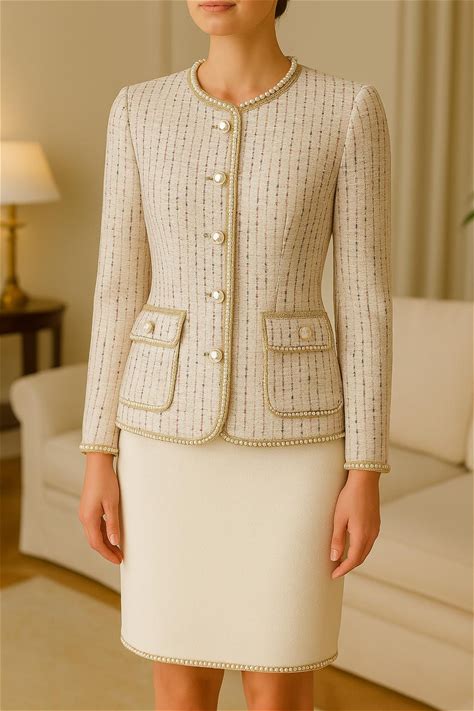 Cream Tweed Skirt Suit With Gold And Pearl Trim - Elegant Two-Piece Outfit For Women