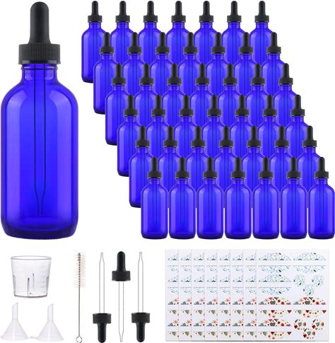 Comrzor 48 Pack 2Oz Cobalt Blue Glass Bottles With Glass Eye Droppers For Essential Oils, Perfumes & Lab Chemicals (Brush, Funnels, 2 Extra Droppers,