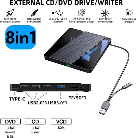 External CD/DVD Drive For Laptop 7 in 1 USB 3.0 DVD Player Portable 7 in 1 External CD/DVD Burner Drive USB 3.0 Type-C Type A CD-ROM Laptop