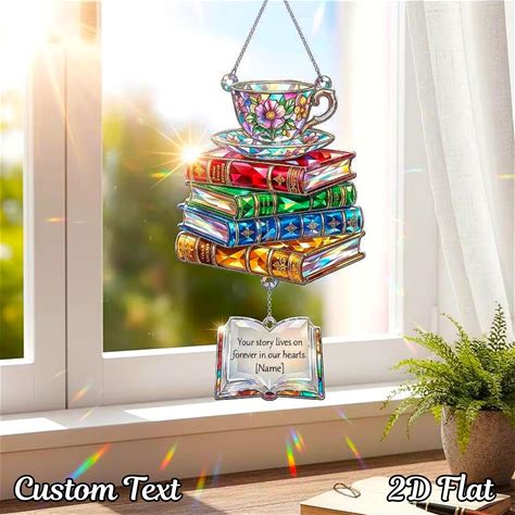 Personalized Book Stack Suncatcher, Faux Stained Glass Teacup Window Hanging