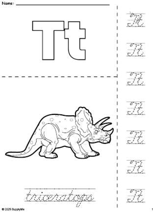Printable Triceratops Coloring Page And Cursive Letter Tracing Worksheet, Letter T Worksheet For Preschool, Pre-K, And Kindergarten, PDF