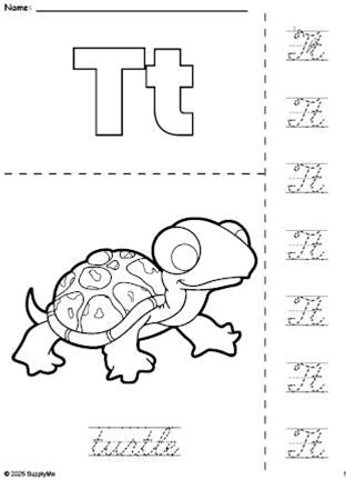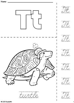 Printable Turtle Coloring Page And Cursive Letter Tracing Worksheet, Letter T Worksheet For Preschool, Pre-K, And Kindergarten, PDF