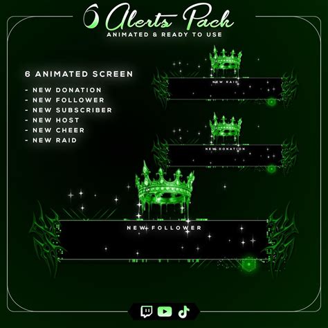 Green Royal Stream Alerts Pack | 6 Twitch Alerts | Neon Crown Animated Alerts | OBS & Streamlabs