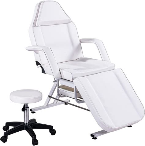 White Massage Leather Chair Esthetician Bed With Hydraulic Stool, Multi-Purpose 3-Section Facial Bed Table, Adjustable
