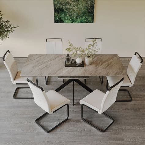 NYEESS Glass Dining Table Set For 6, 63" White Dinner Room Table Set For 6, Modern Kitchen Table With 6 Upholstered PU Leather Dining Chairs For