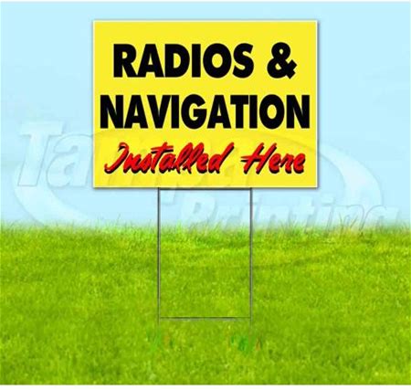 Radios & Navigation Installed Here Yellow Cursive (18" X 24") Yard Sign, Includes Metal Step Stake